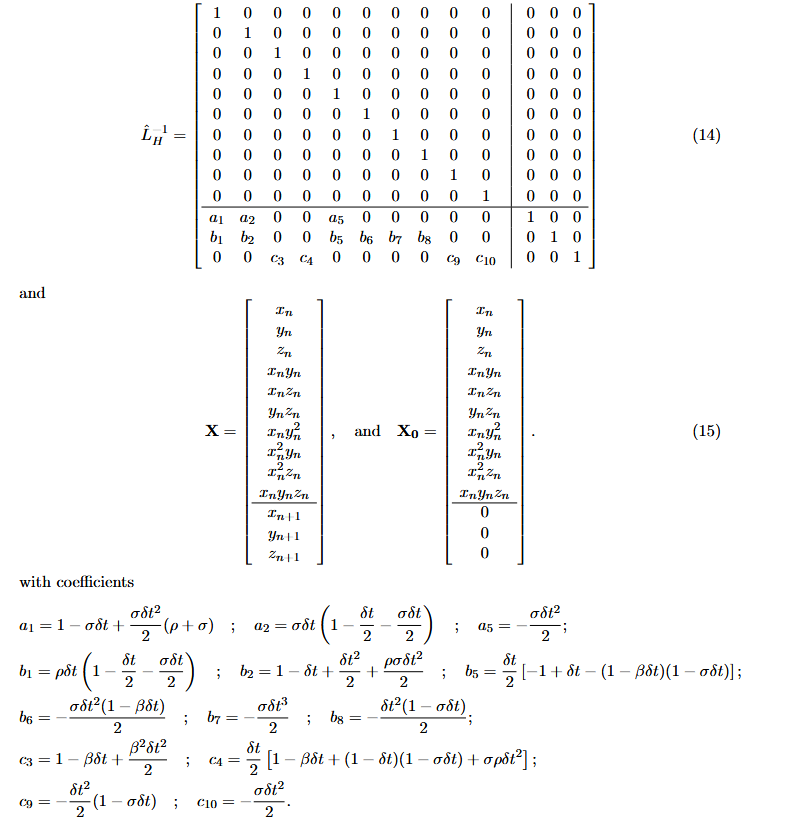 A scheme is created to implement the Lorenz Attractor. The inverse Heun-matrix of which is shown below: