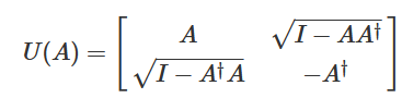 If the norm of A is greater than one, it is normalized to make sure that the resulting U(A) is unitary. The value that is used to normalize this (the normalization constant) is stored in a special variable which we will retrieve later. In our case, many parameters cause the norm of A to be greater than one, so it will be important for us to have this constant, which we will have to multiply with the output of the system to get a de-normalized result.