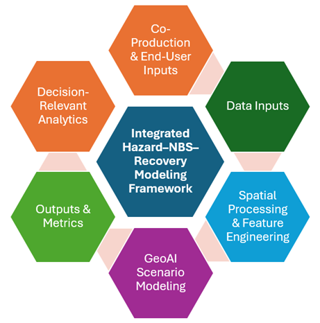 This project develops an Integrated Nature-based Flood Recovery Modeling (INFORM) framework to evaluate the spatial performance of NBS configurations by quantifying how the spatial configuration of NBS influences building-level flood recovery under future sea-level rise conditions (2050–2100). Recovery is modeled as a co-produced trajectory toward functional re-occupancy, integrating repair costs, probability of structural failure, and time-to-re-occupancy ranges and thresholds. The analysis evaluates how NBS density, type, proximity, and connectivity affect recovery outcomes and identifies configurations that produce the greatest reduction in recovery time per dollar invested relative to baseline conditions without NBS.