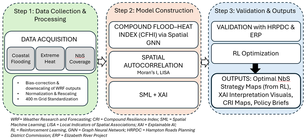 Coastal Virginia is increasingly threatened by compound climate hazards, where coastal flooding and extreme heat interact to create risks for air pollution, human health and ecological communities. This project will develop a spatially integrated framework, AI-enhanced framework to evaluate how Nature-based Solutions (NbS)—including wetlands, living shorelines, dunes, tree canopy, and conserved lands—mitigate overlapping flood and heat exposures across Hampton Roads. It evaluates how different NbS types coincide with or reduce compound flood-heat (CFH) hazards, identifying which NbS are most effective for heat or flood mitigation and under what spatial contexts.